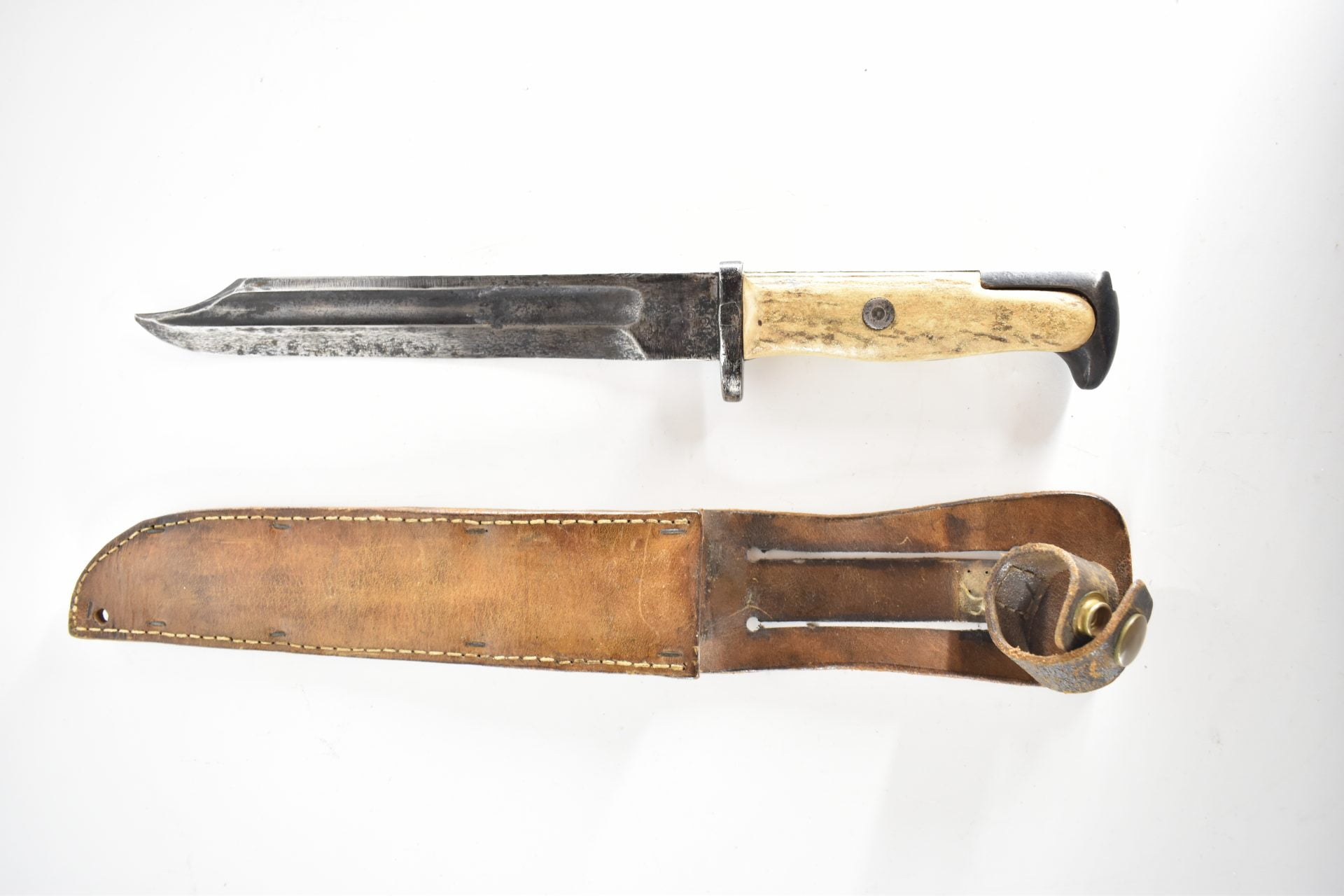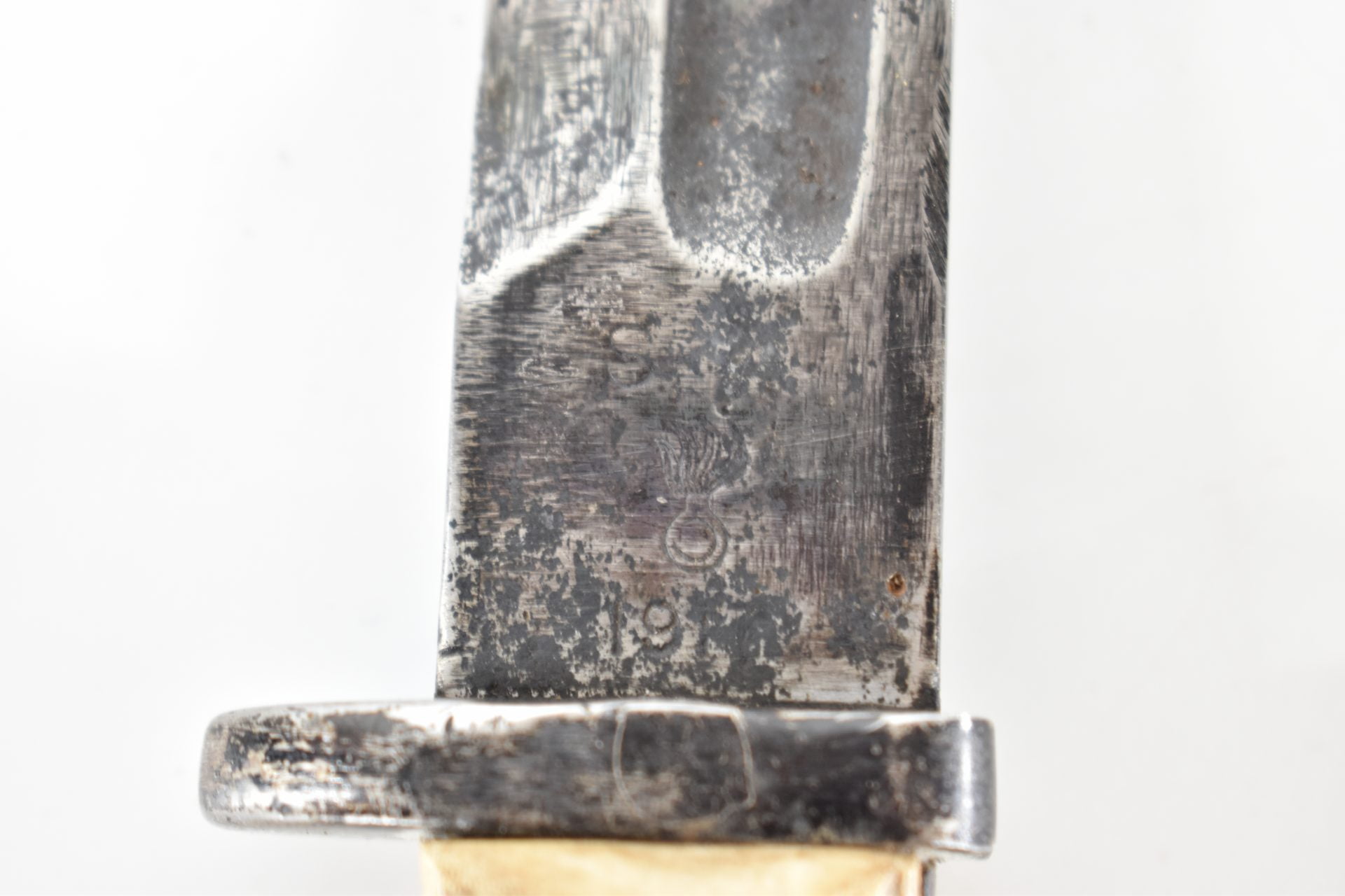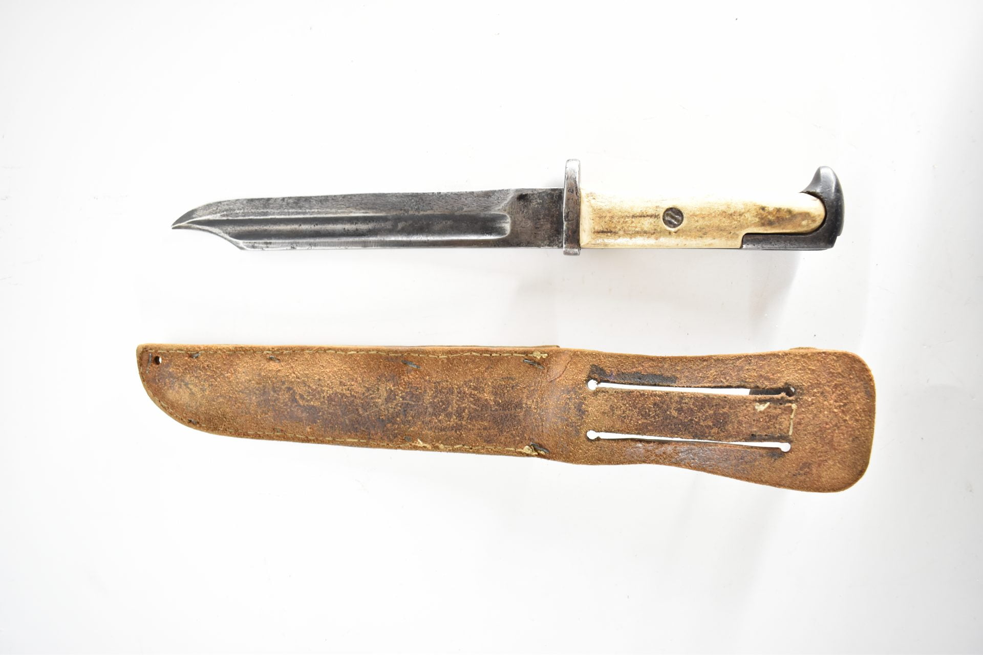 Here we have a bayonet cutdown (probably M1905) during WW2 to produce this fighting Knife. Knife has a private made bone carved handle and still has its original pre-WW1 bayonet markings. Many WW1 bayonets were indeed converted into fighting knives or shorter bayonets during WW2 due to high demand.