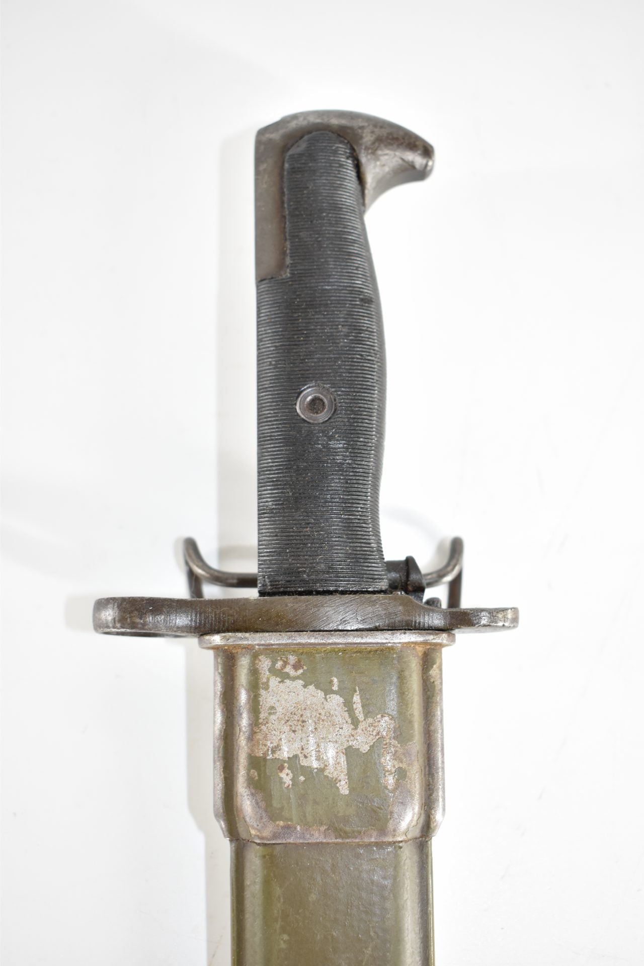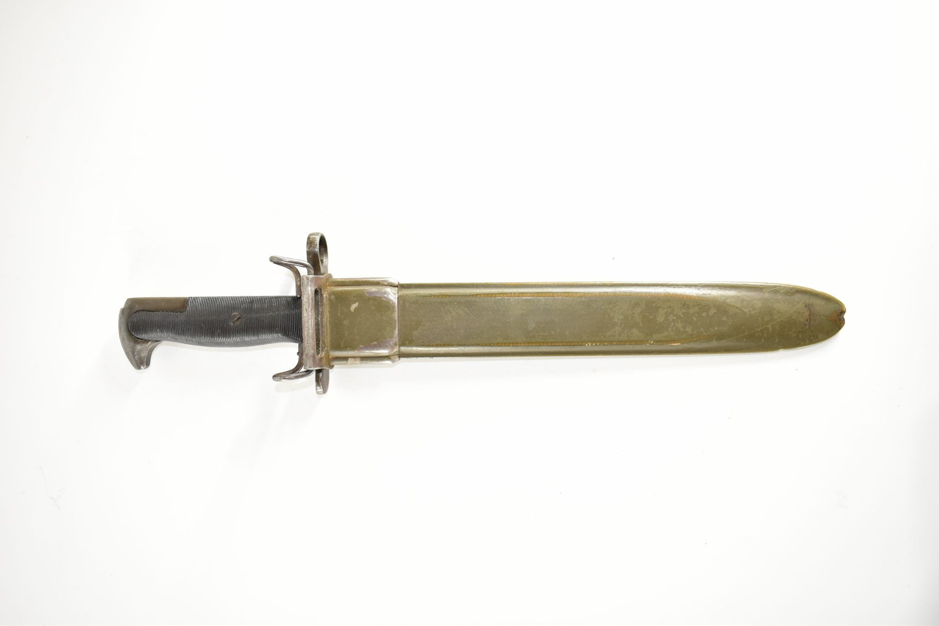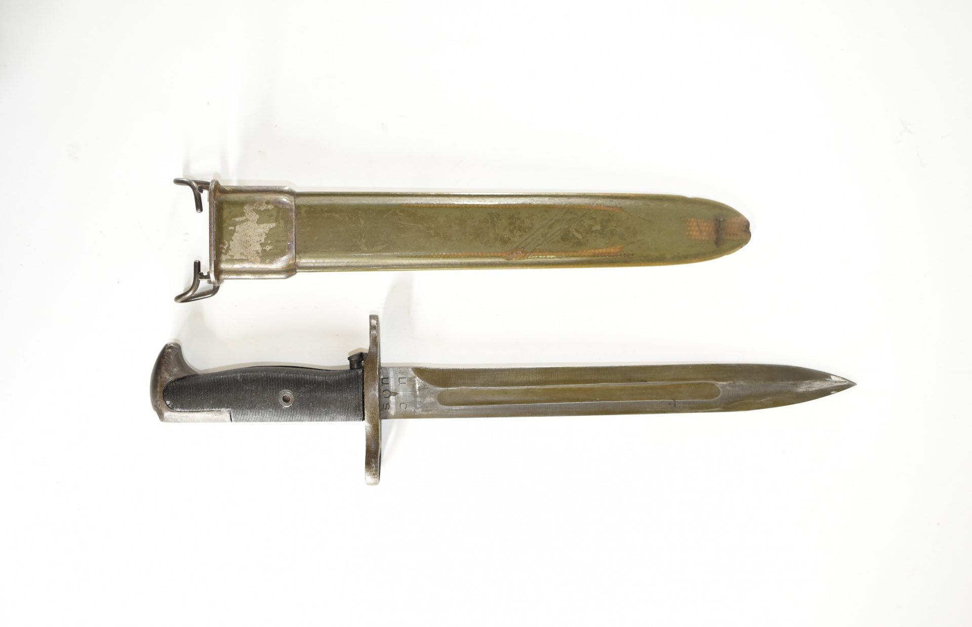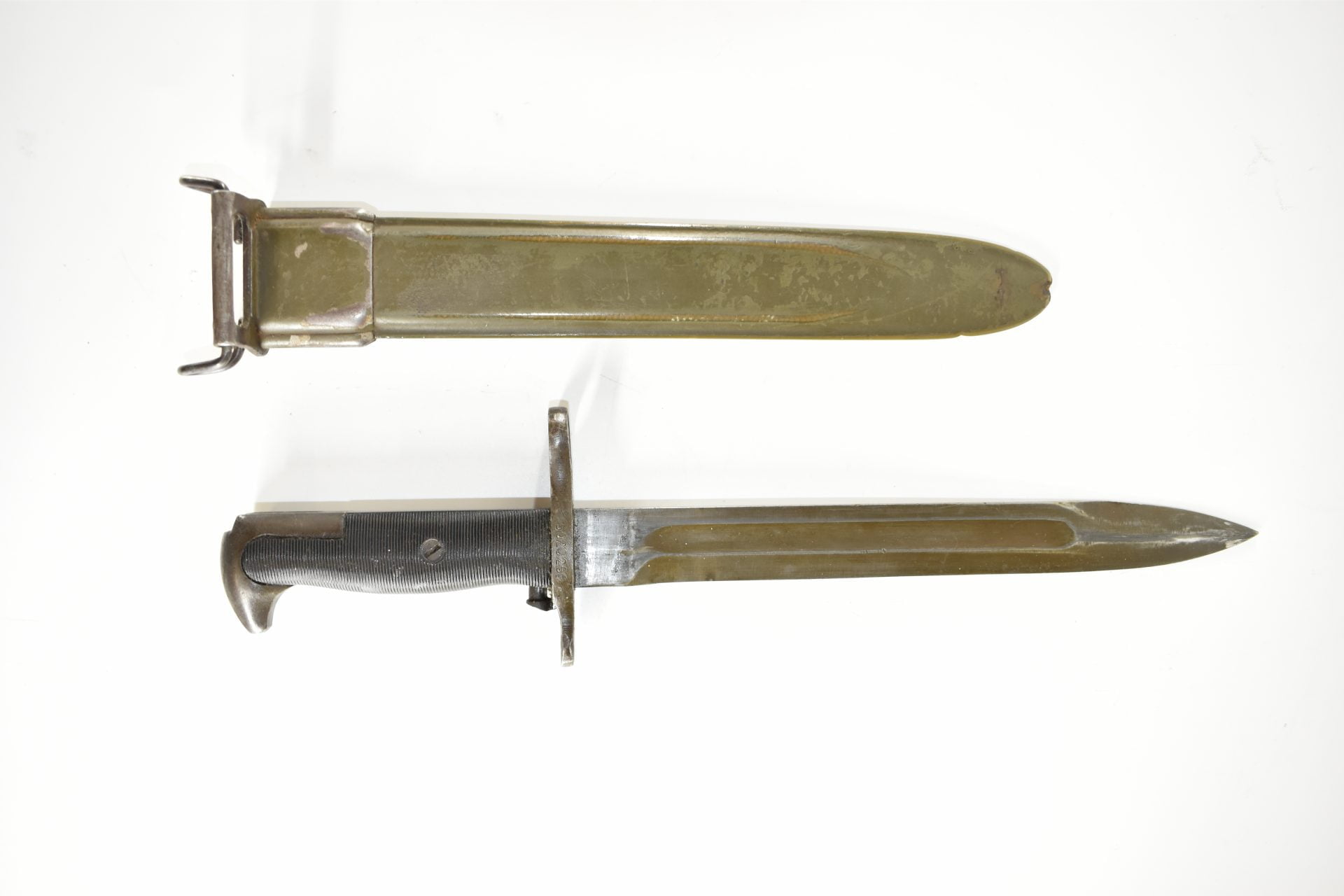 This UC manufactured Bayonet is complete with its scabberd and belt hook. Scabberd has lost some of its green paint but is a nice WW2 example! General condition is good+.