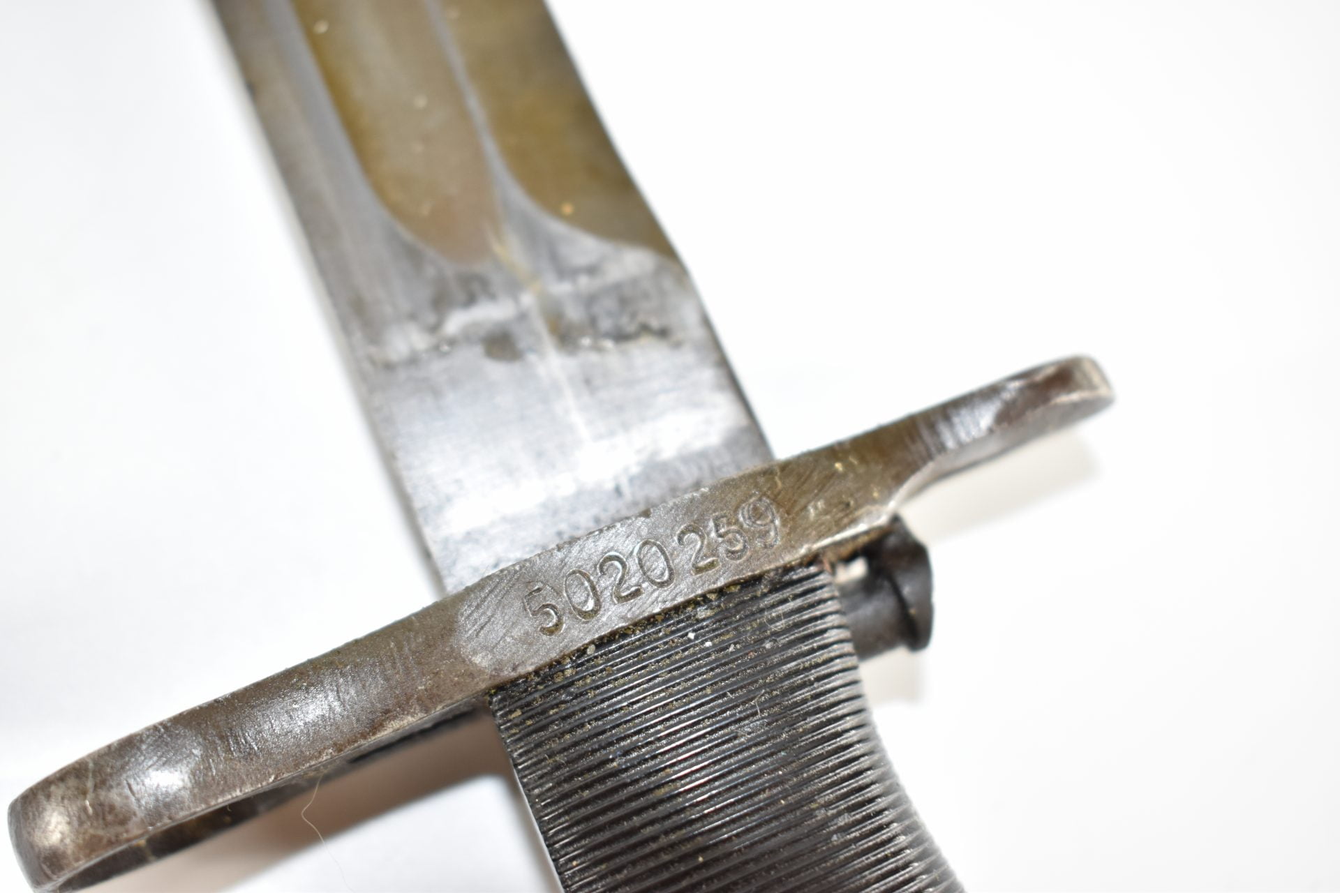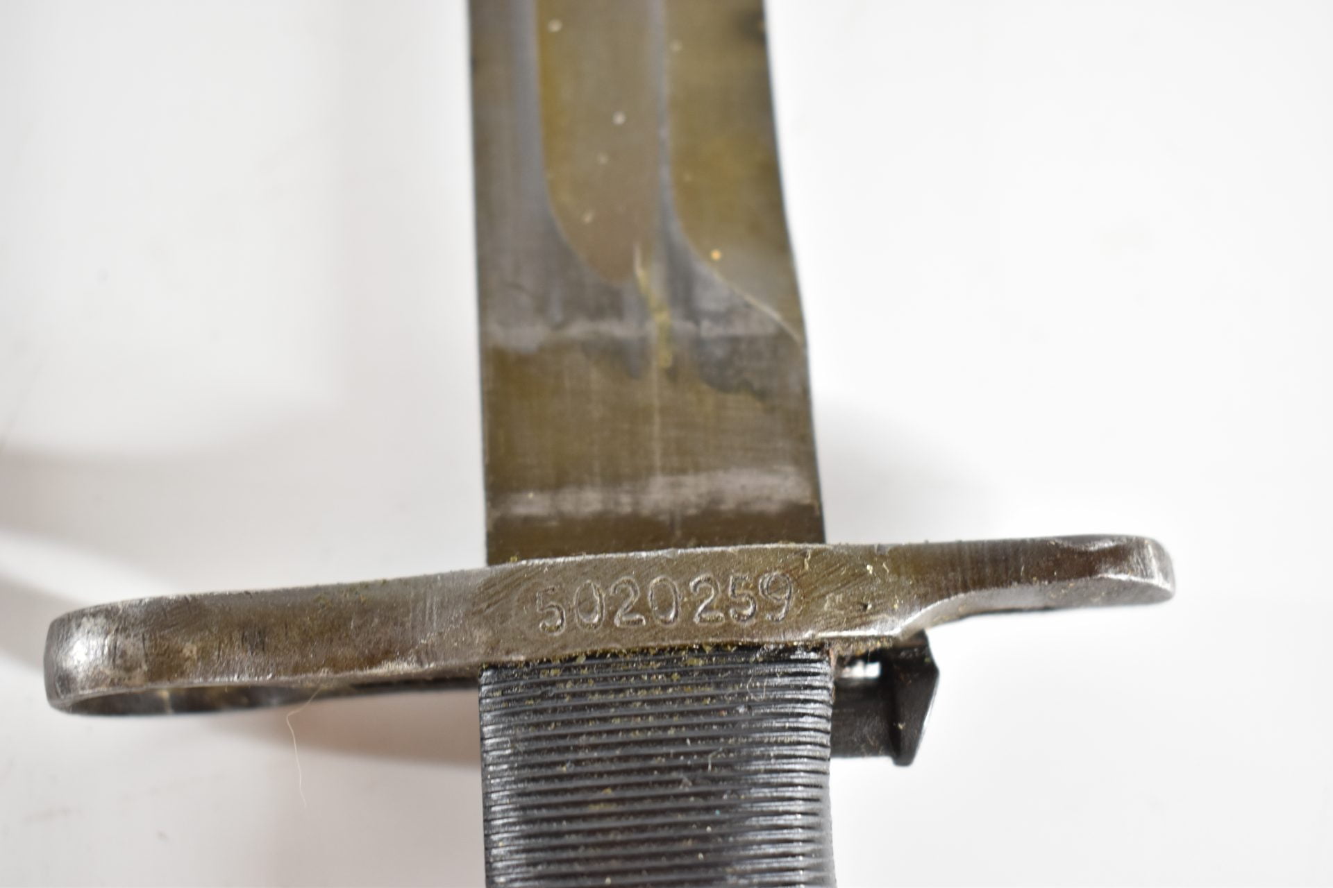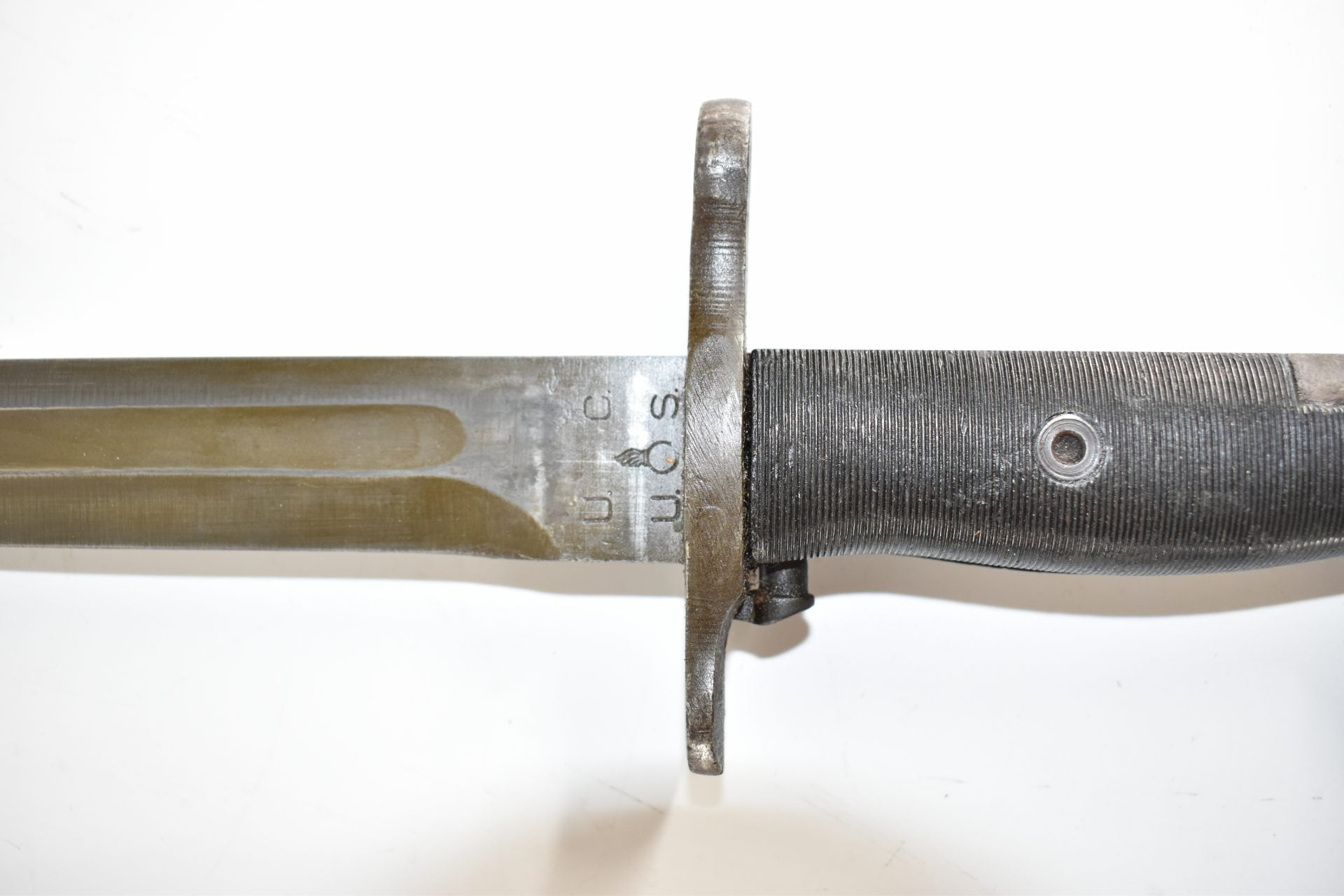 Here we have a WW2 U.S M1 Garand (short version 10”) Bayonet, After testing in early 1943, the U.S. Army decided to shorten the M1905 bayonet’s blade to 10 inches (25.4 cm). Production of this new bayonet, designated the M1, began at the five remaining manufacturers by April 1943. Bayonet is produced by UC (Utica Cutlery) Scabberd is the M3 made of resin-impregnated cotton duck canvas with a metal throat, and was equipped with a wire hook hanger.