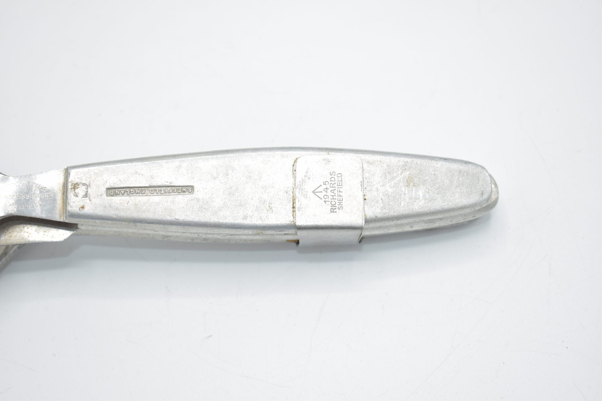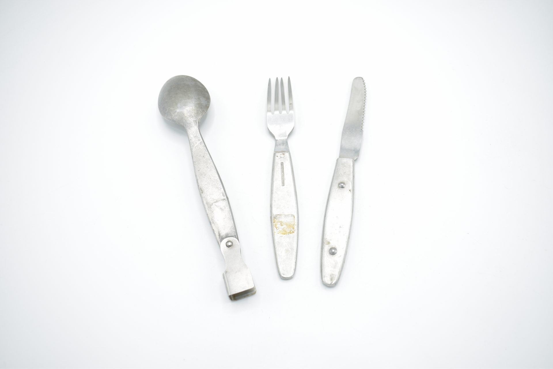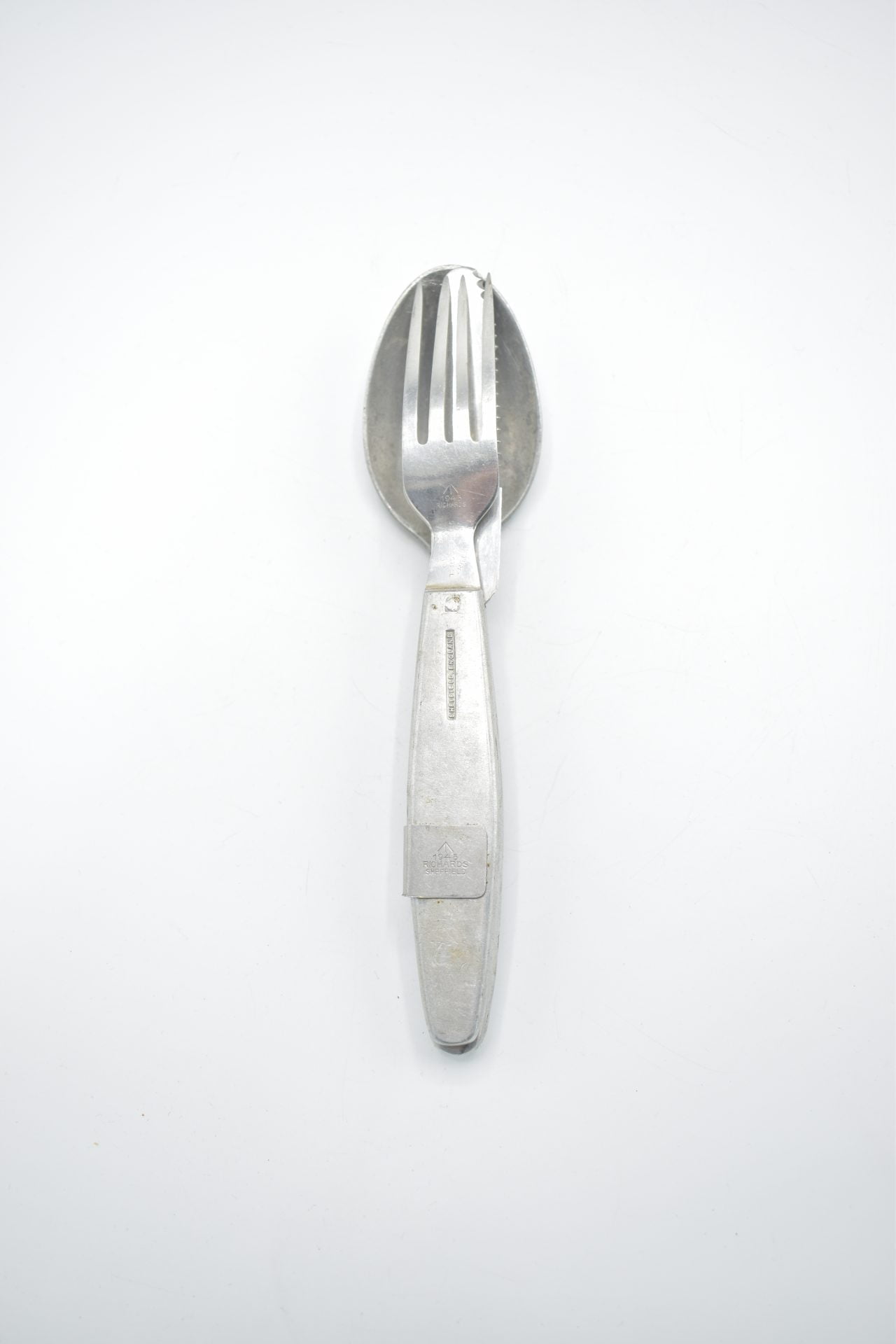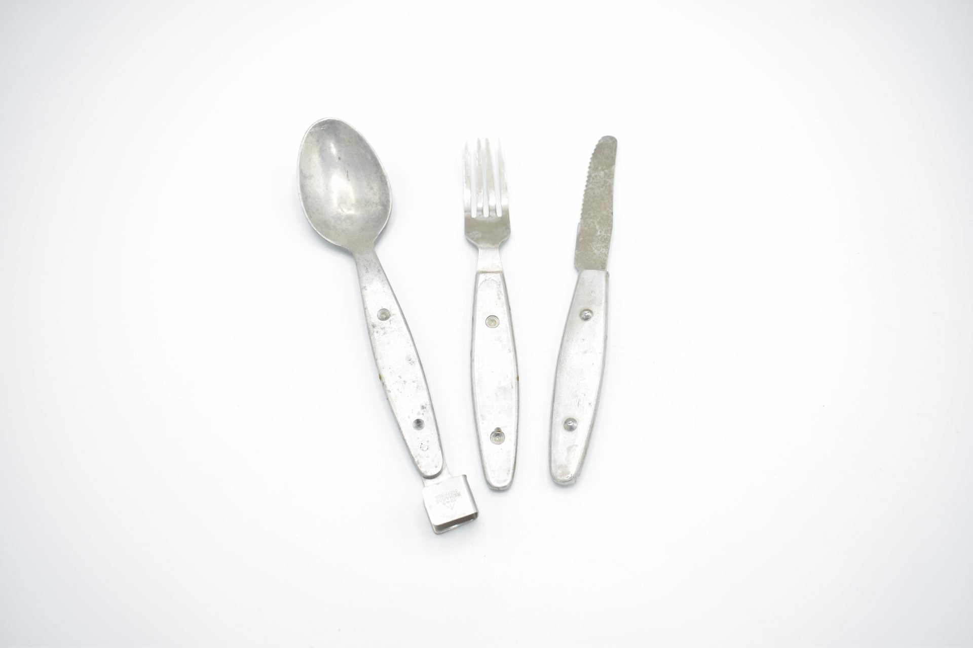 Here we have a knife, fork and spoon set of aluminium and stainless steel with WD (War Department), broad arrow mark and dated 1945. Comparable to the German Göffel set, which however was not in individual pieces. Possibly used in the final phase of WW2, light use, slight age, and storage marks. Marked Richards Sheffield and made from stainless steel in Sheffield England. I assume these sets were kept in the mess tin.