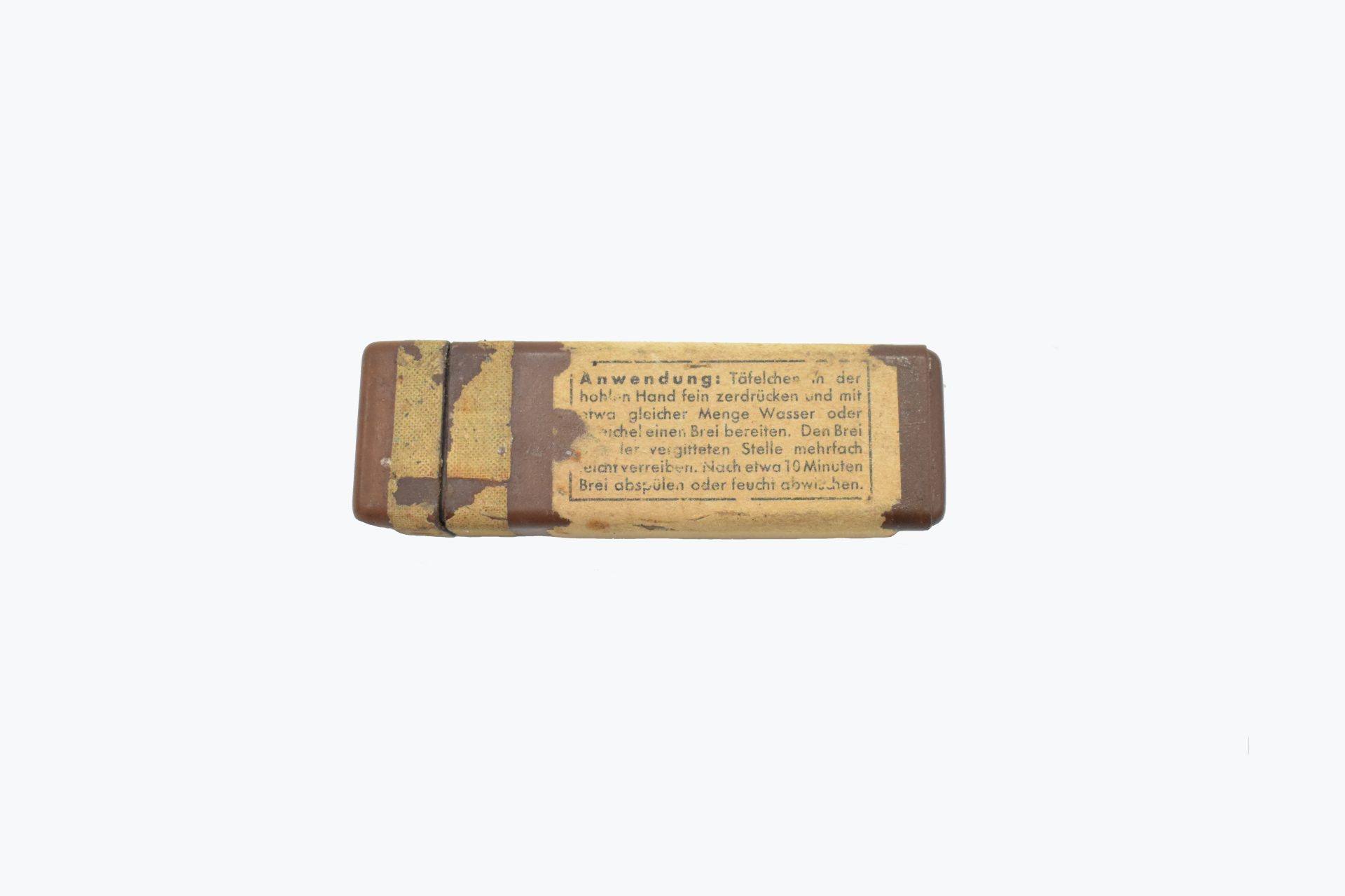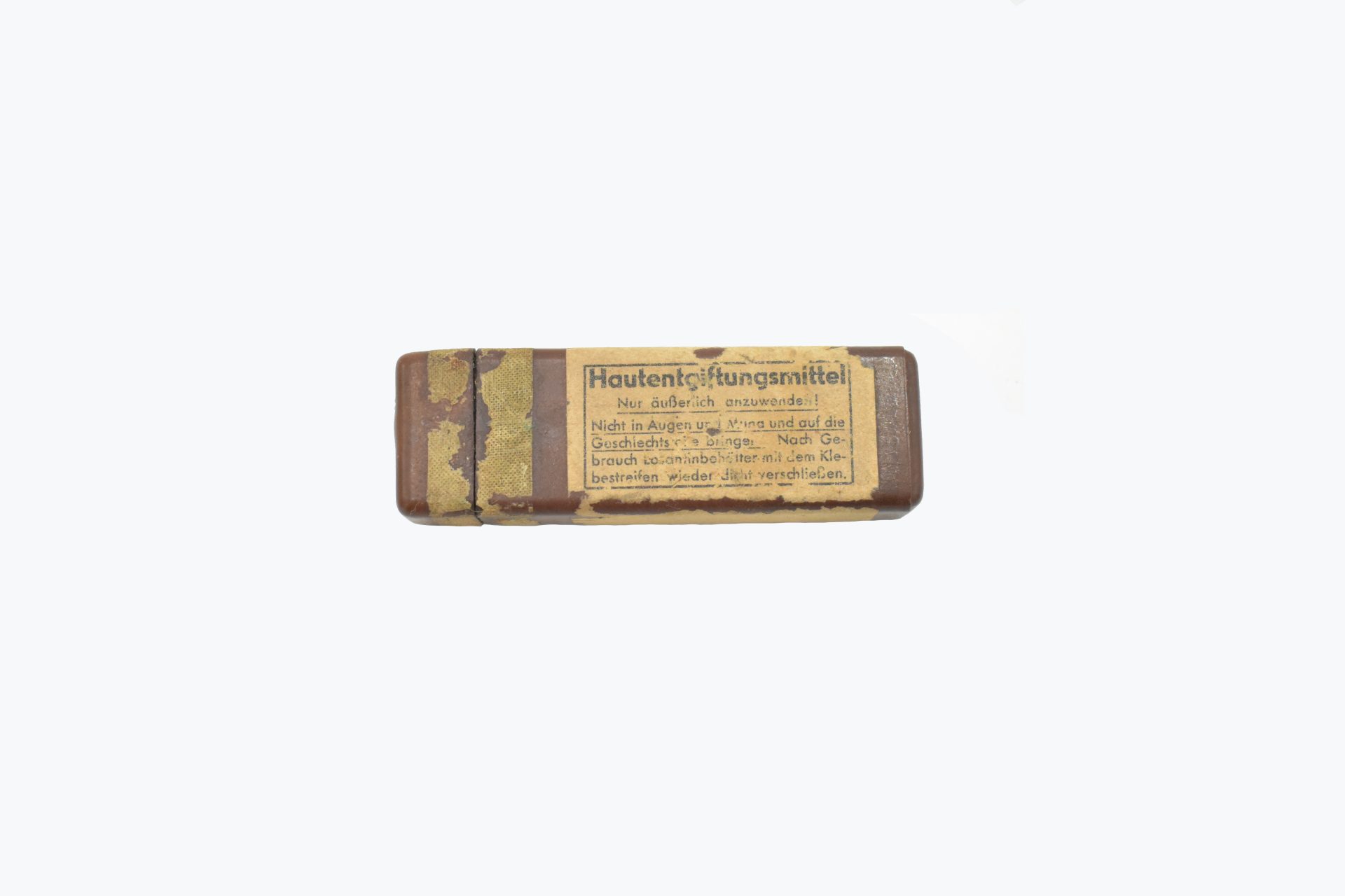 Wehrmacht Hautentgiftungsmittel marked 1941 gbj The box belongs in every Wehrmacht M31 gasmask cannister. The tablets where used to clean the skin after a poison gas attack. “Hautentgiftung” Dated “1941” and made by gbj