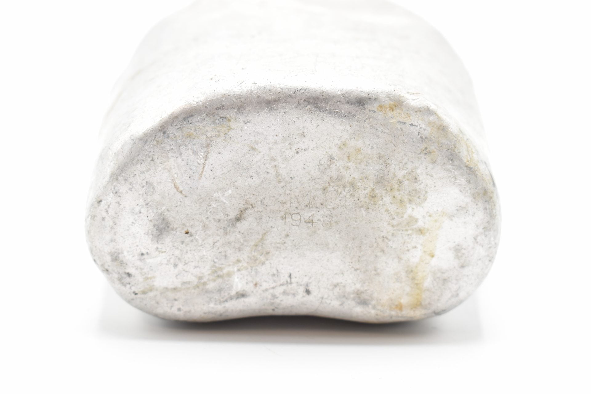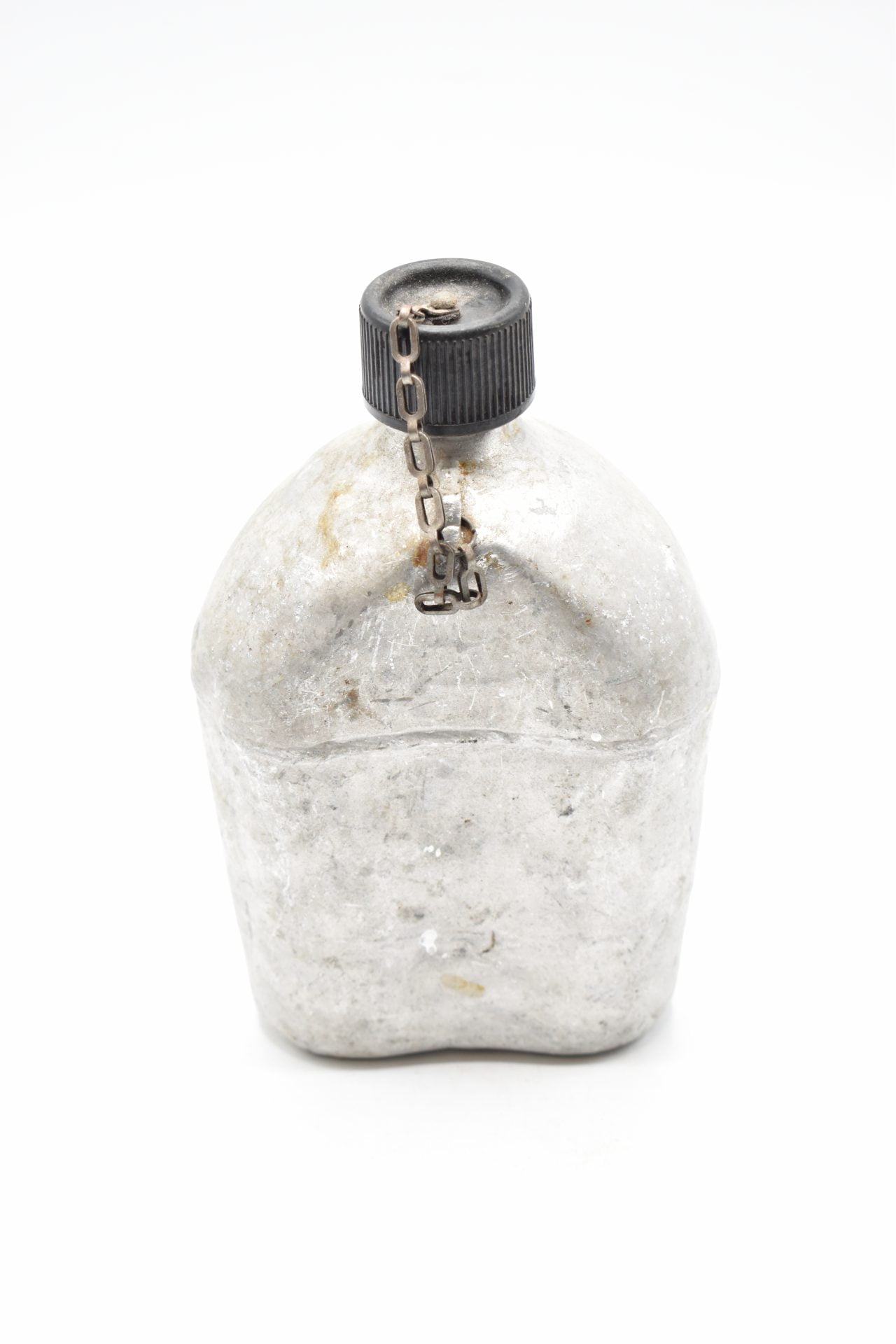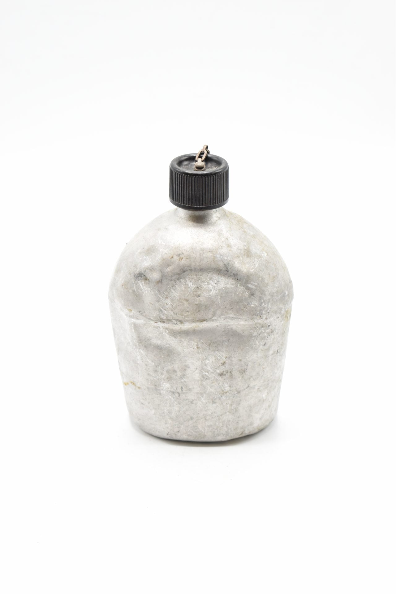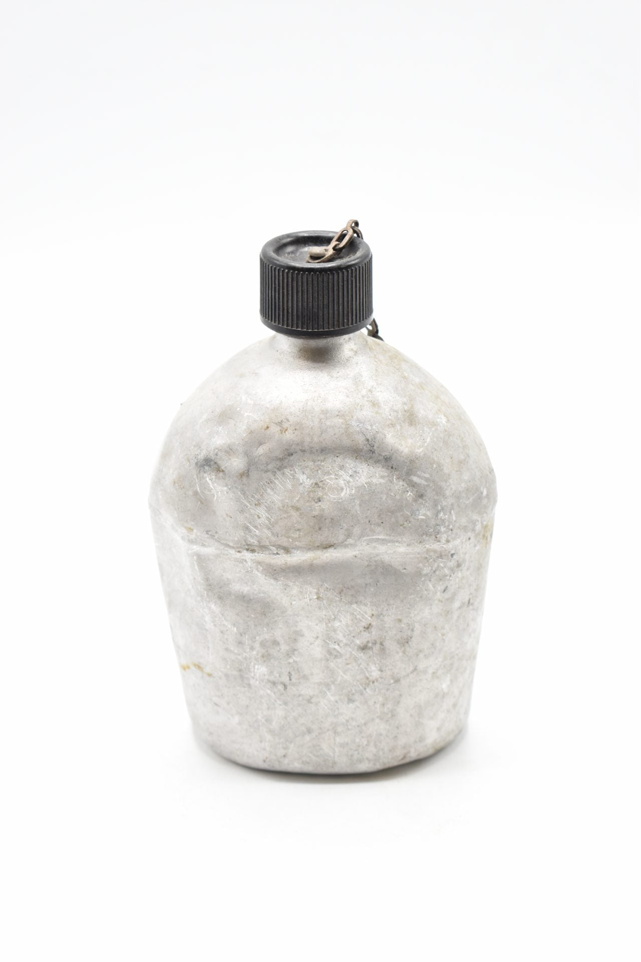 Here we offer an original US Military Field Canteen from WW2 produced by the S.M Co (Southern Metals Company)  The canteen is made of Aluminum or Stainless and has a screw-on black plastic cap attached with a chain to the canteen. The bottom is marked U.S. SM Co 1943. Unfortunately no canvas cover came with this canteen.