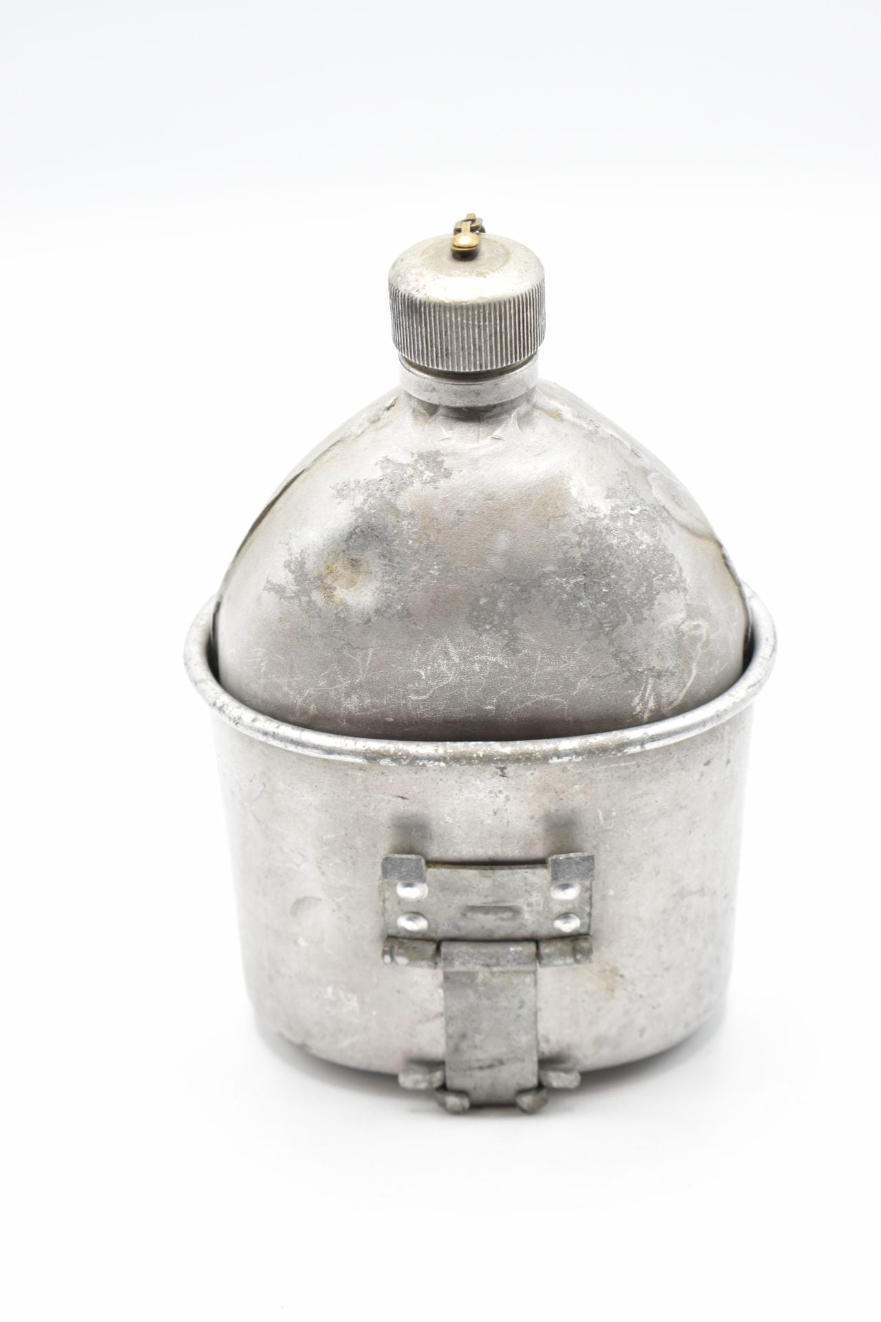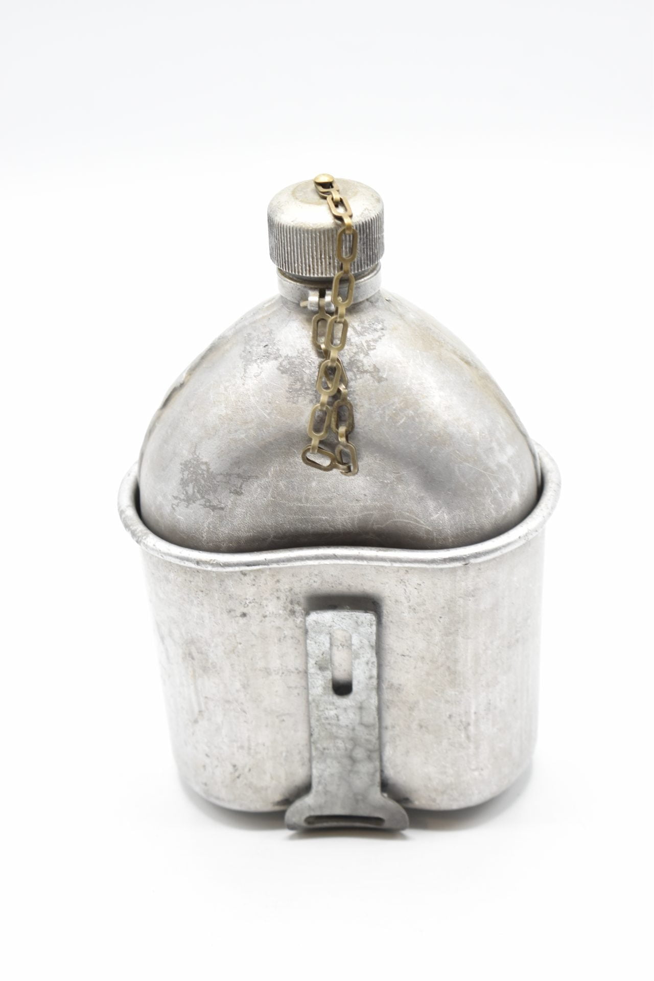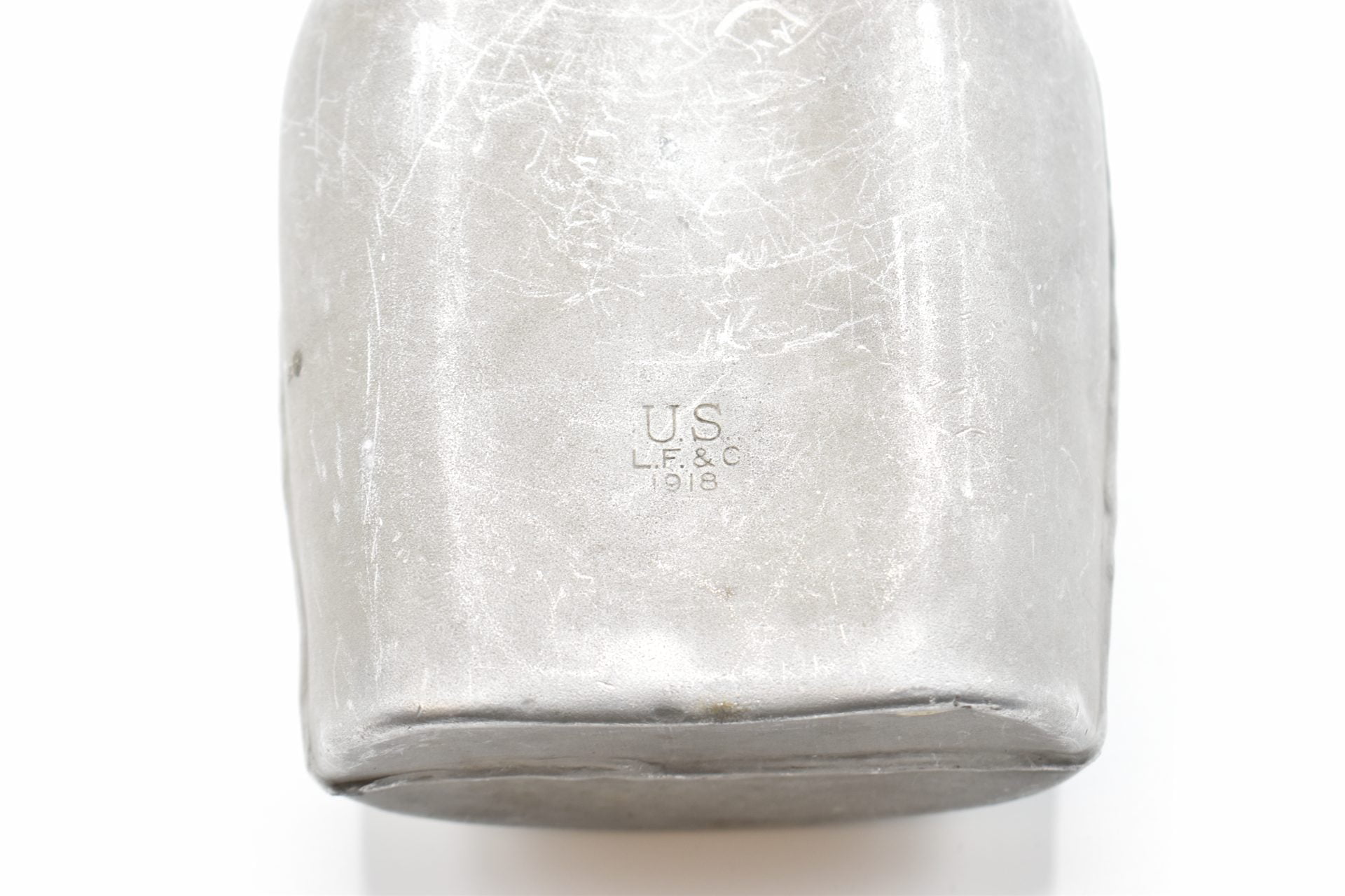 Here we offer an original U.S WW1 Military Field Canteen with the original cup and canvas cover produced by the L.F & C.Co (Landers, Frary & Clark).The canteen is made of Aluminum or Stainless and has a screw-on aluminium cap attached with a chain to the canteen. The bottom is marked U.S.1918 L.F & C.Co.