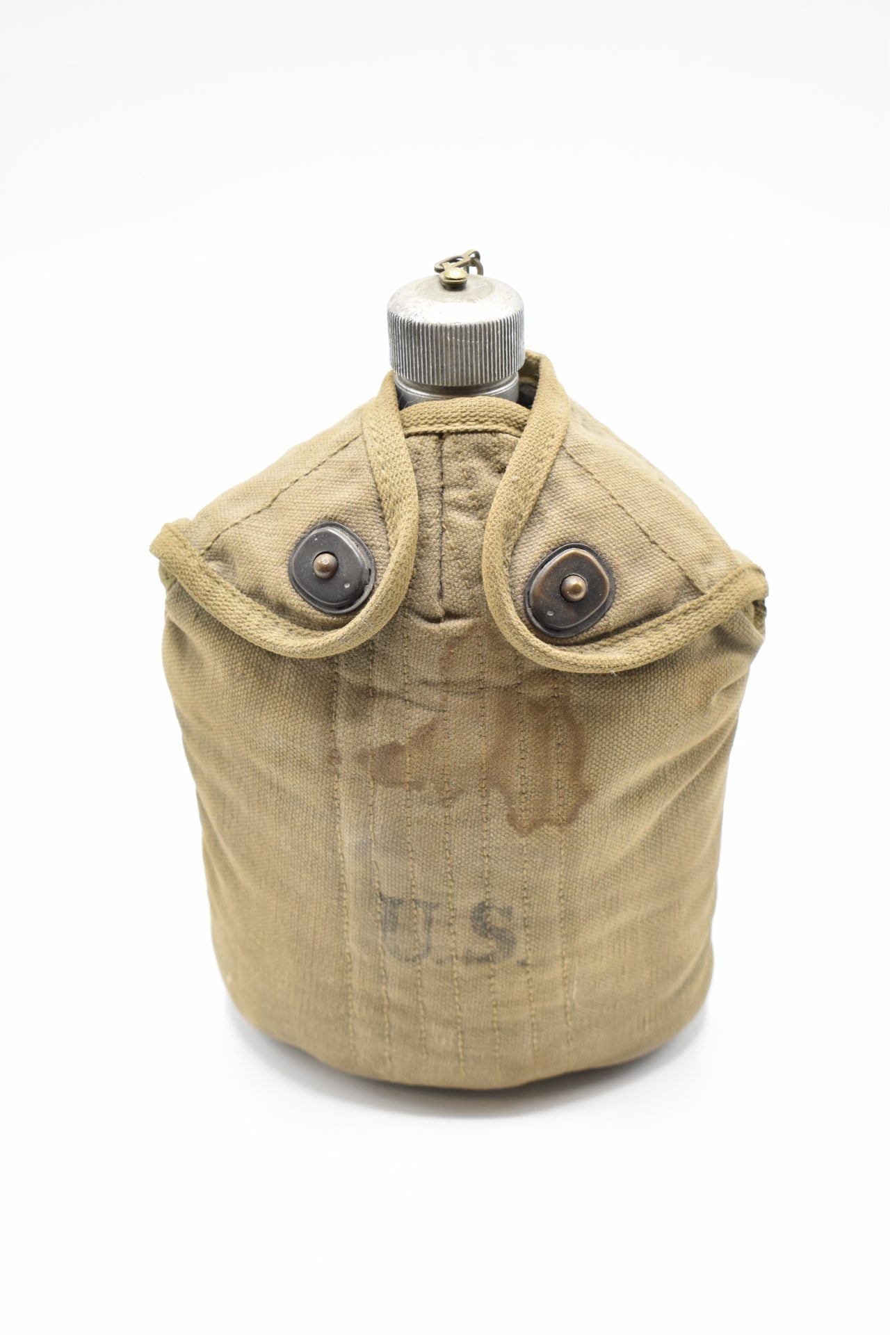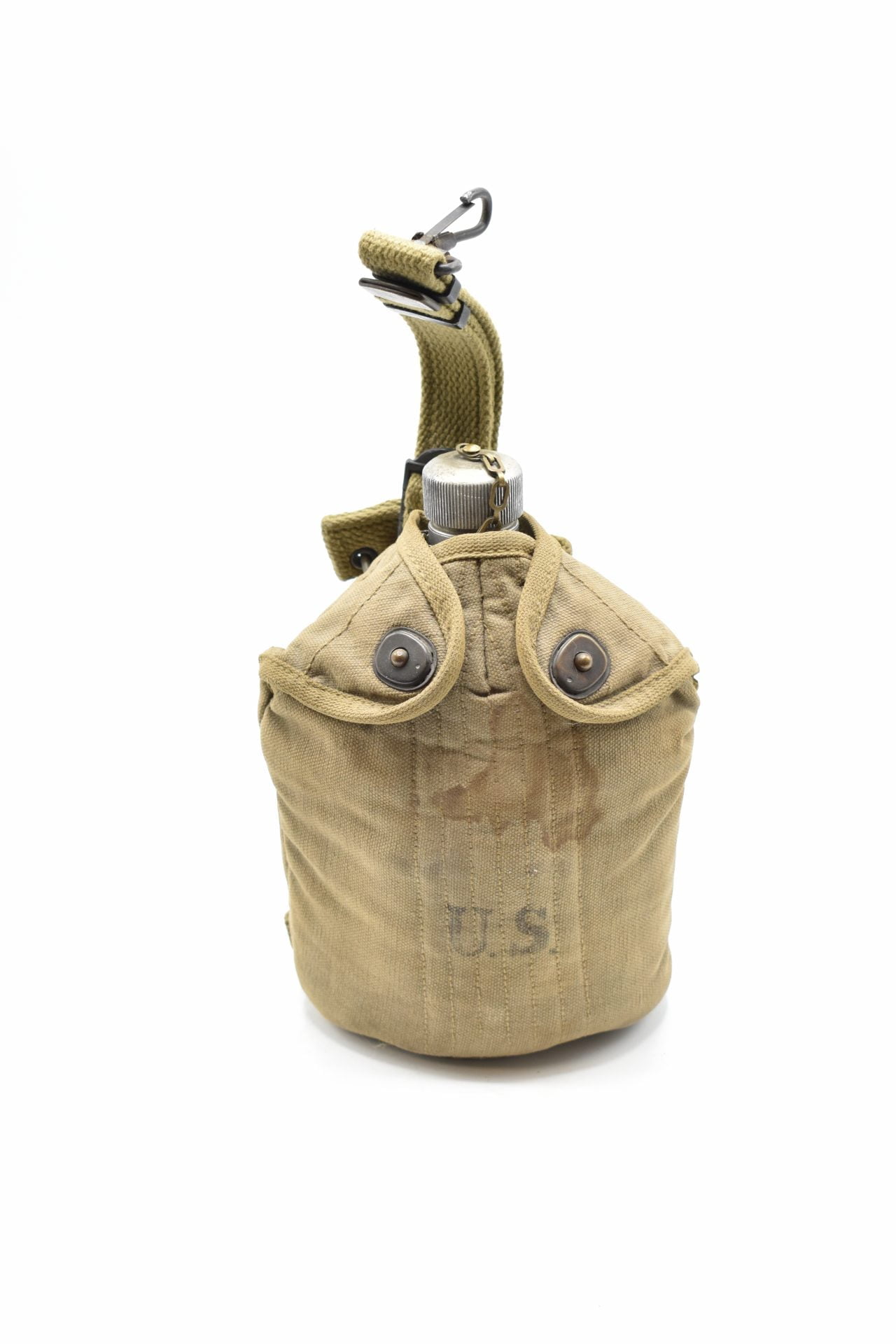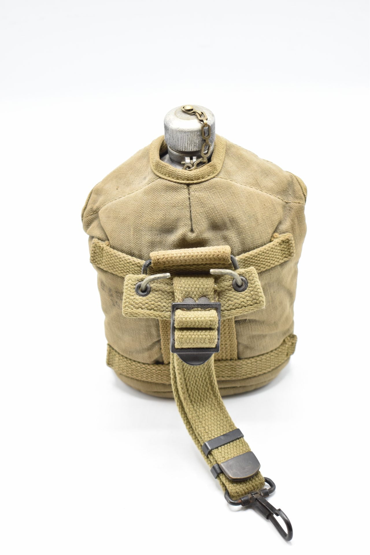 Here we offer an original U.S WW1 Military Field Canteen with the original cup and canvas cover produced by the L.F & C.Co (Landers, Frary & Clark).The canteen is made of Aluminum or Stainless and has a screw-on aluminium cap attached with a chain to the canteen. The bottom is marked U.S.1918 L.F & C.Co.