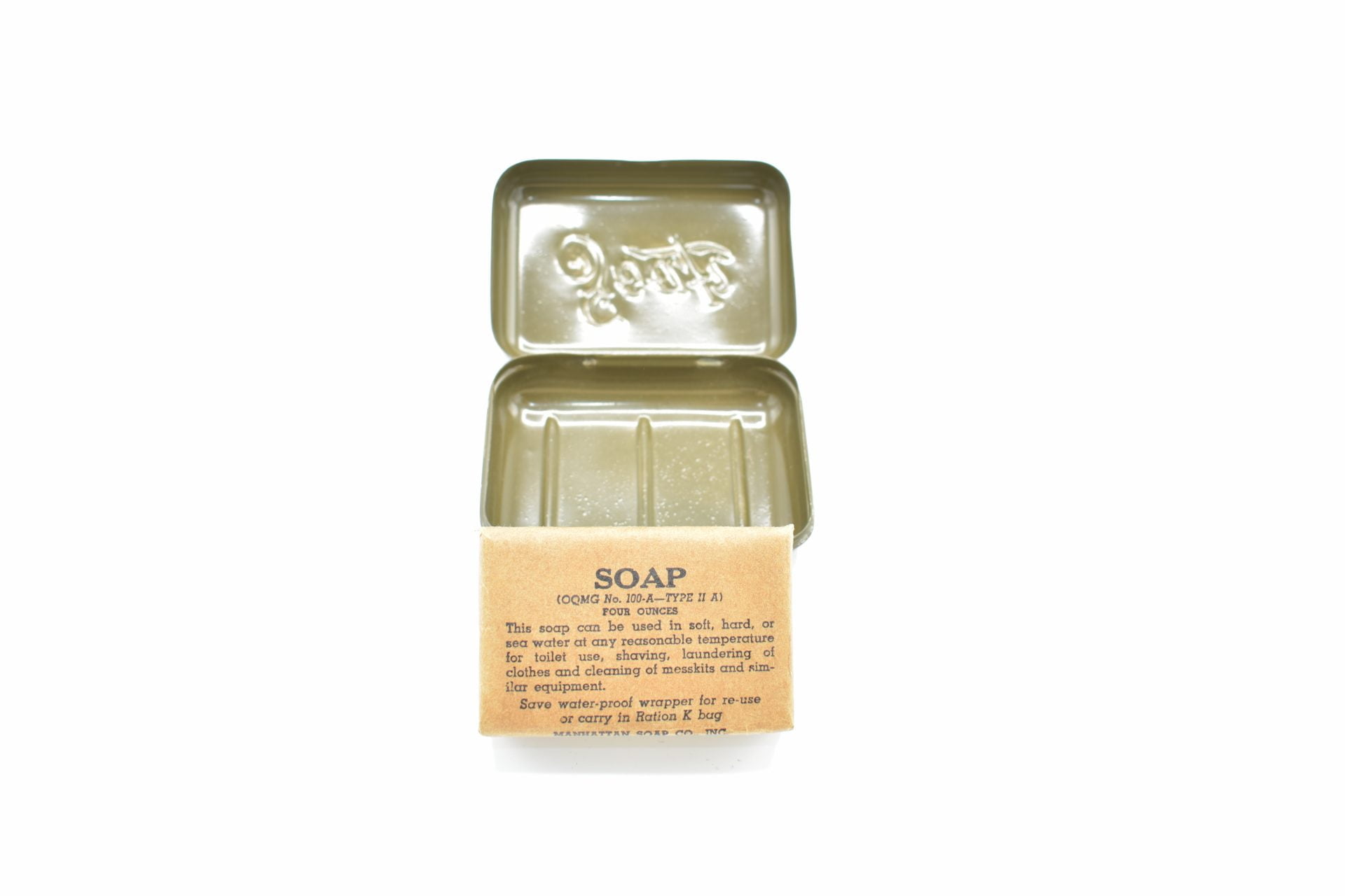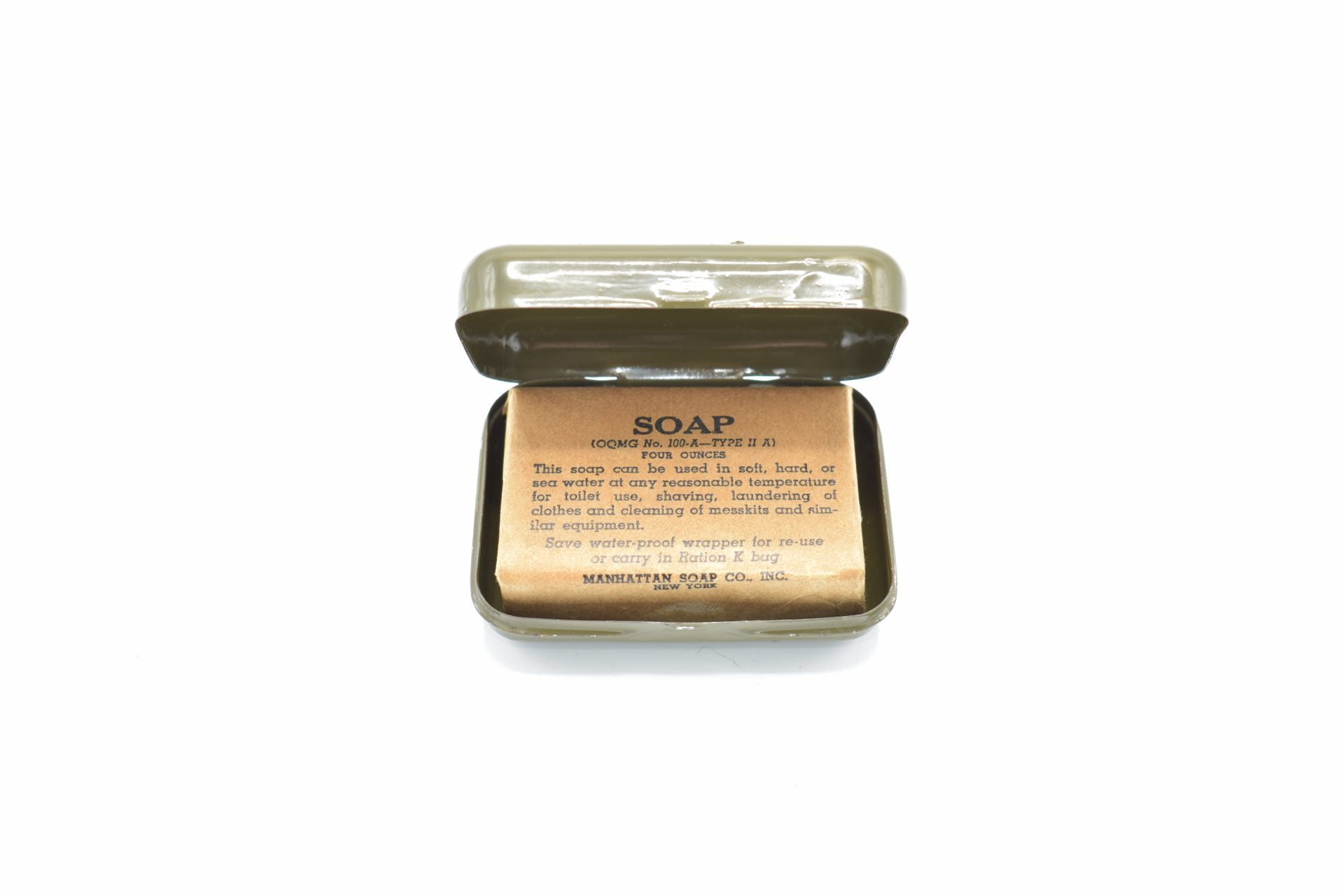 Here we have a U.S WW2 metal container with an original bar of WW2 soap. Soap bar was produced by the ‘Manhattan Soap Co INC New York‘. Both container and Soap bar are in good to very good condition.