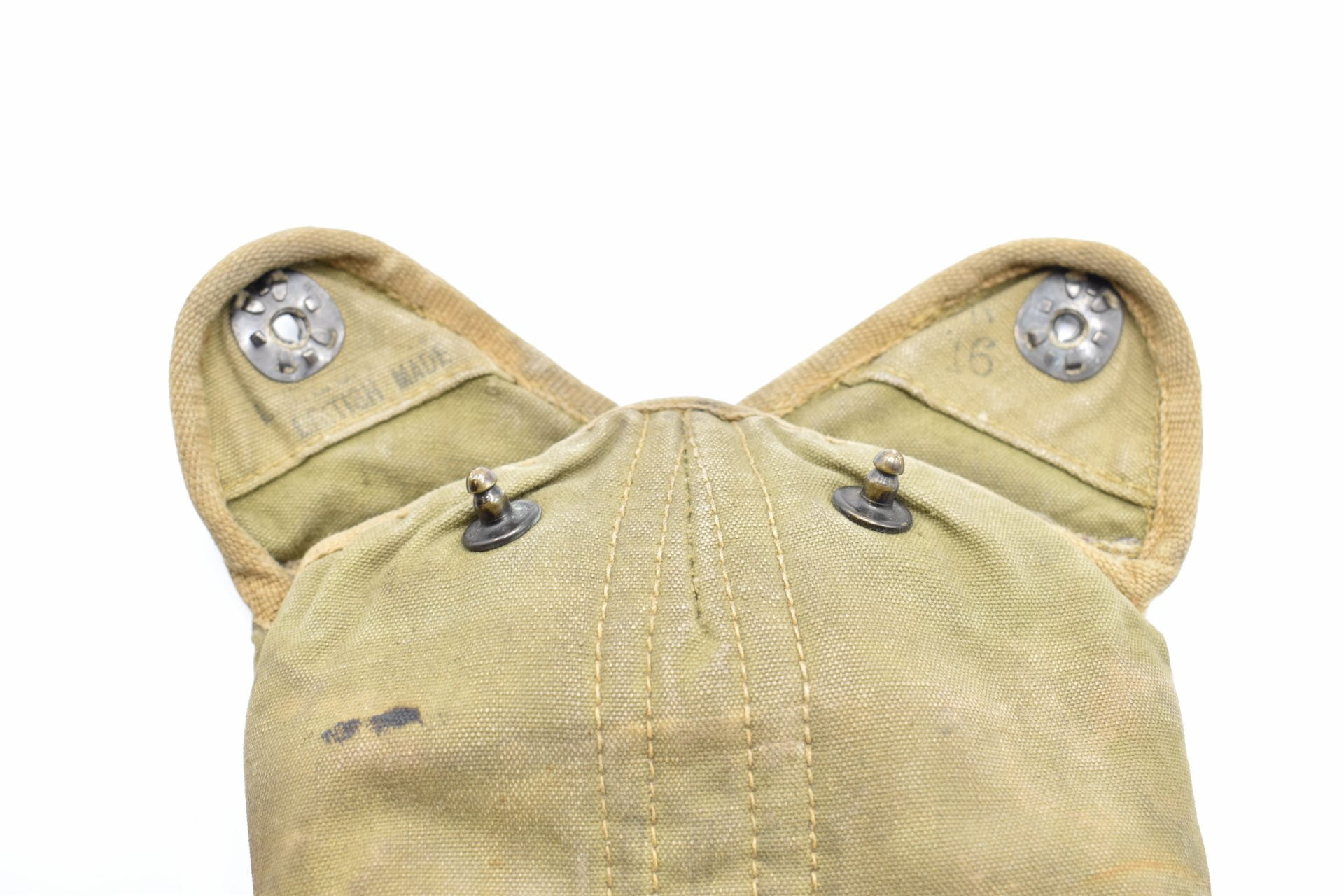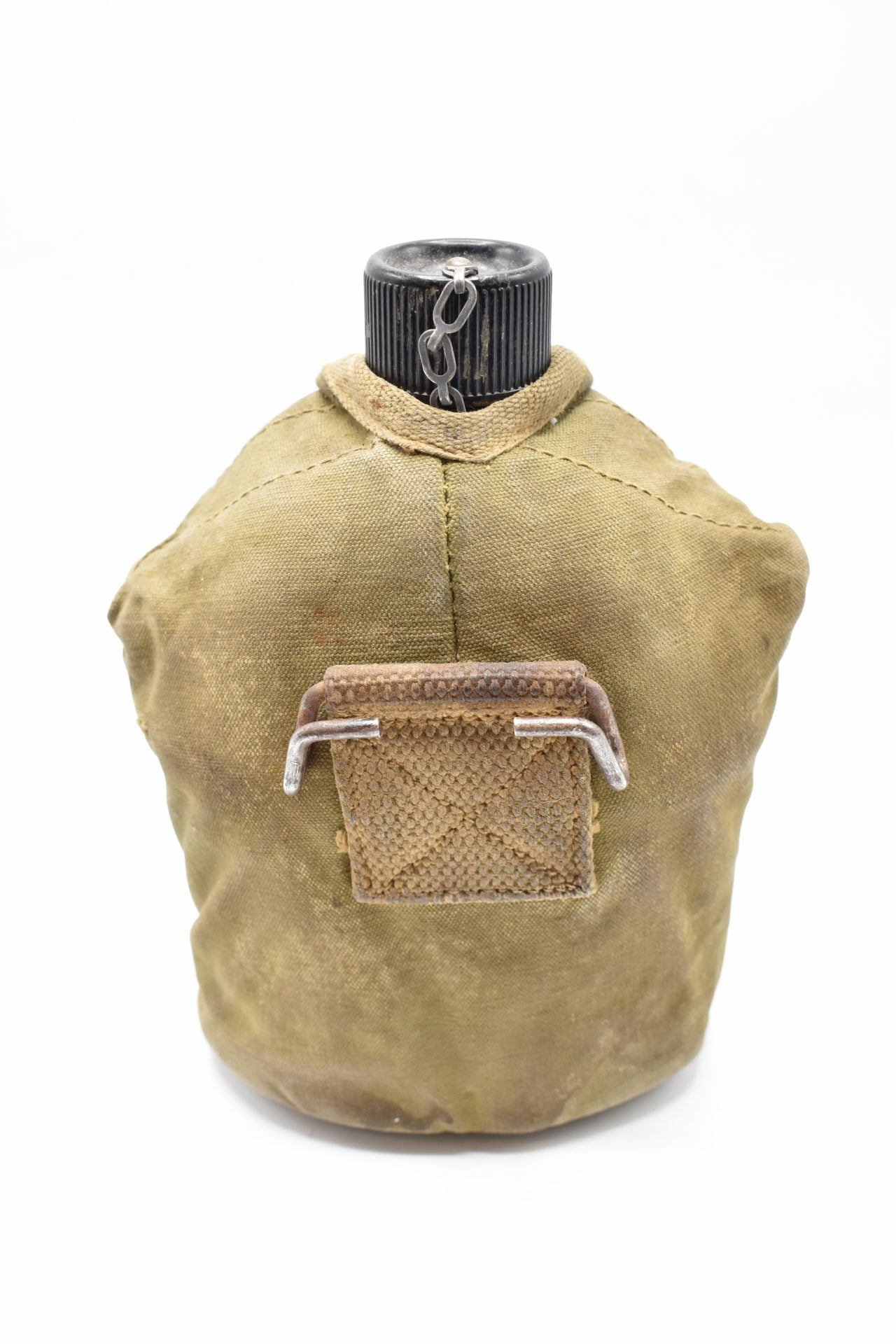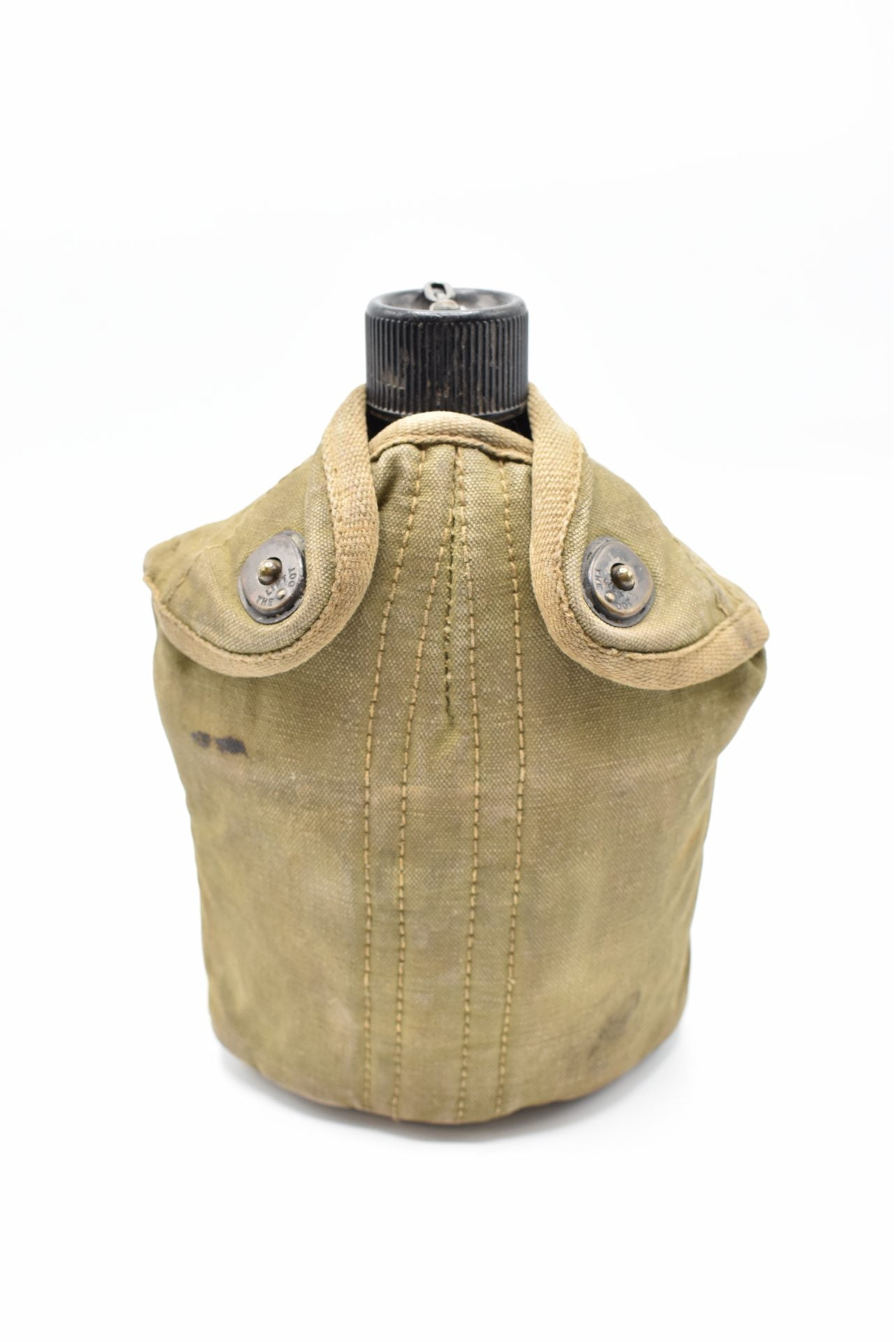 Here we offer an original US Military Field Canteen with the original cup and canvas cover from WW2 produced by the S.M Co (Southern Metals Company) The canteen is made of Aluminum or Stainless and has a screw-on black plastic cap attached with a chain to the canteen. The bottom is marked U.S. SM Co 1944. The canvas cover has two pull snaps and hooks in the back.