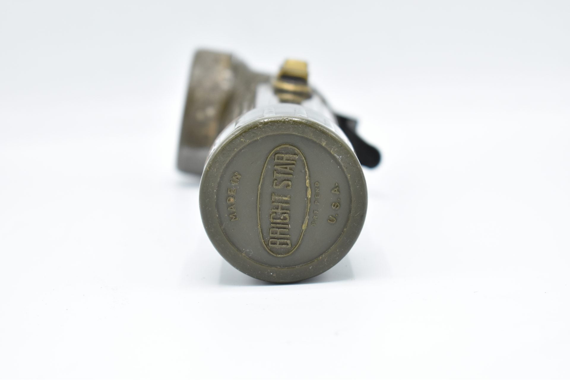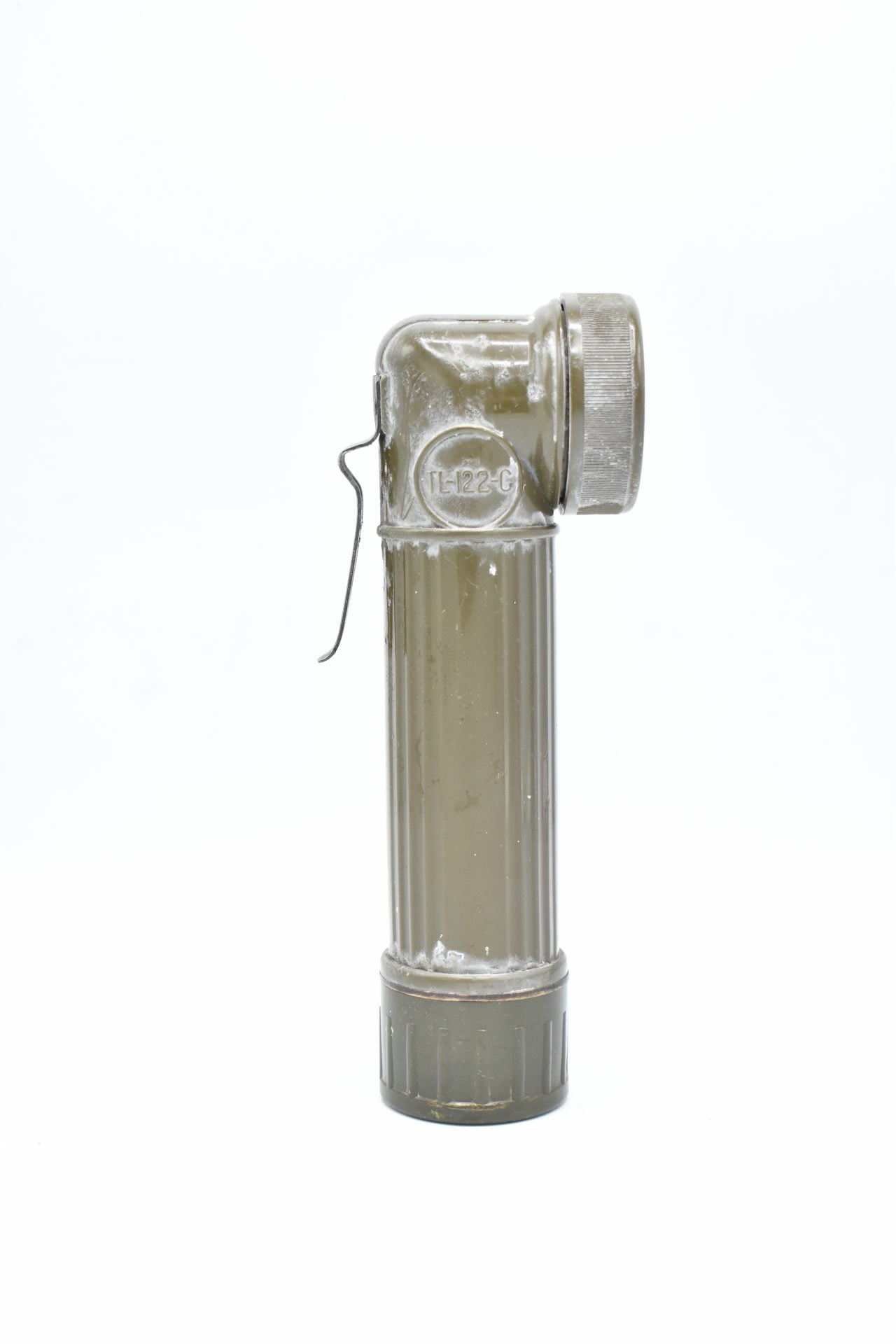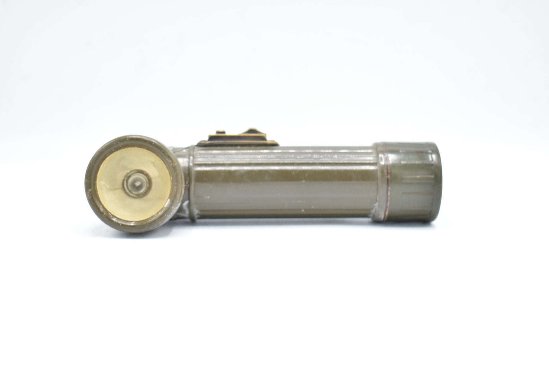 Here we have a U.S WW2 Flashlight this was the most widely used torch issued to U.S troops during WW2. The body is made of plastic instead of metal to help the war effort, manufacturer was Bright Star. This plastic torch is also more reliable than earlier metal version’s. The clip on the back allows it to be clipped onto your webbing and the right angle designed lets the light shine in front of you. This TL-122C Flashlight has an extended base that would contain lens filters in blue/red/clear plus spare bulb. Issued late in 1944. The TL-122C was comprised of Improved plastic, moisture proof design, issued April 1944.