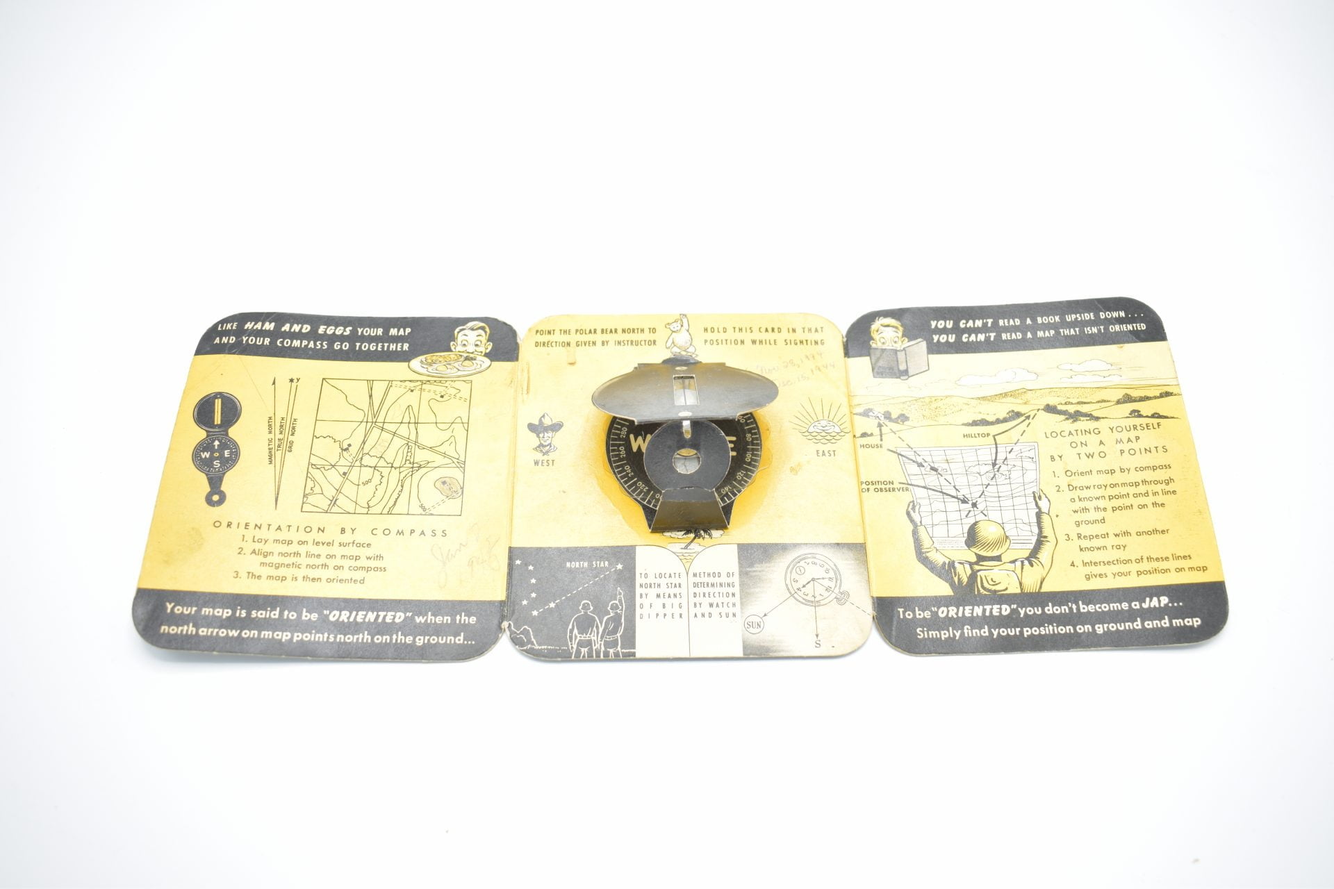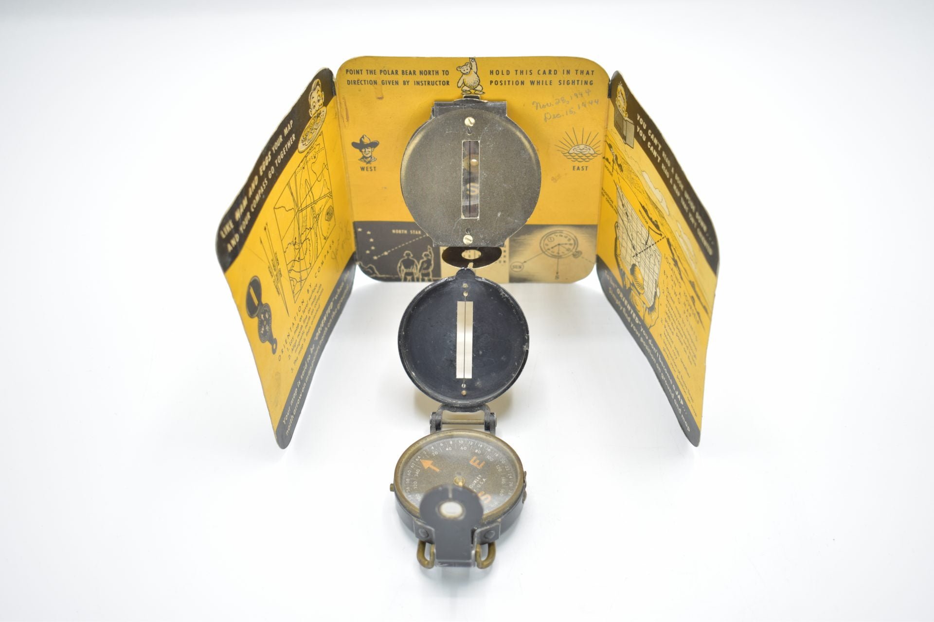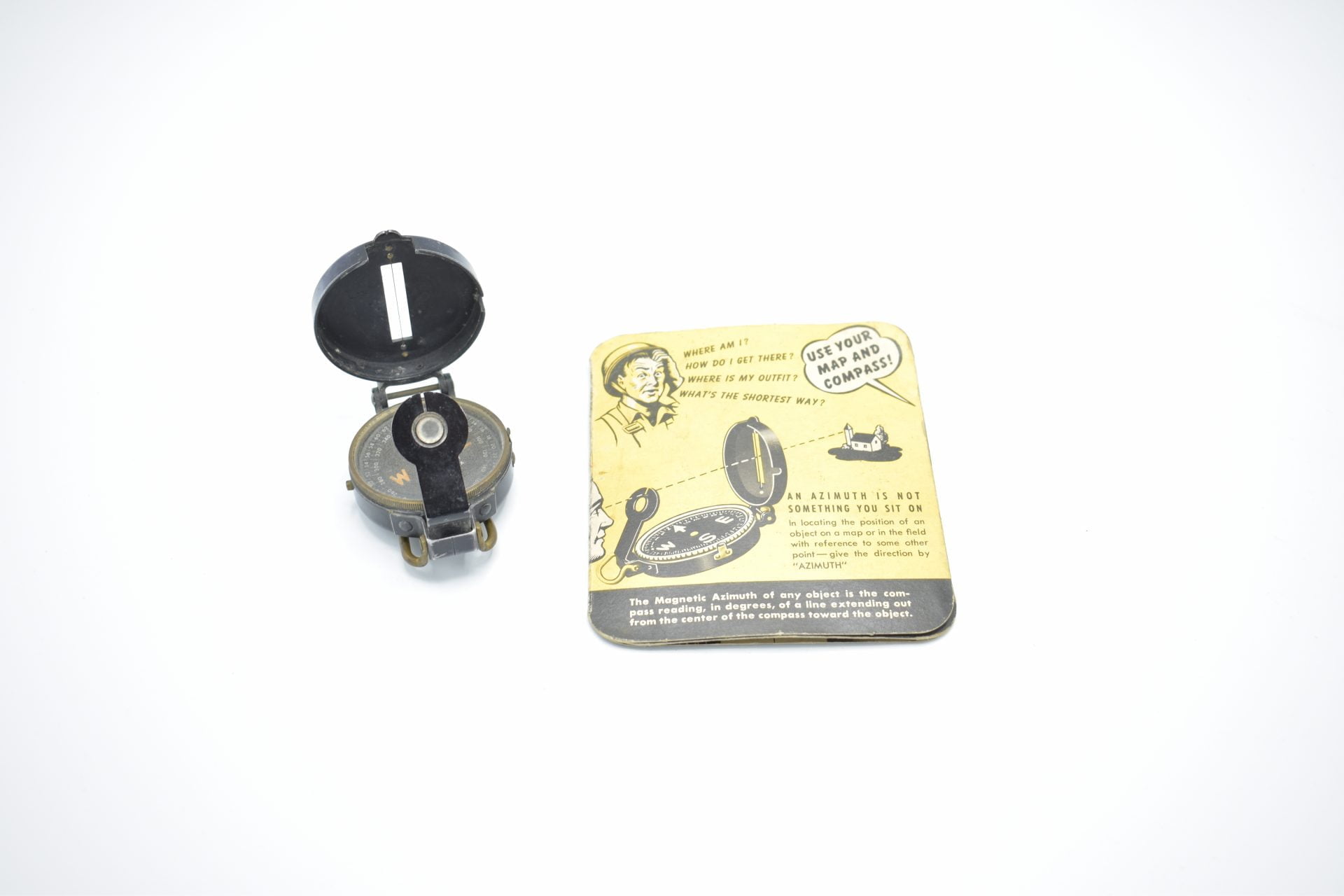 Here we have a U.S WW2 Lensatic compass plus it’s very rare Instruction sheet.The Lensatic Compass, the most common military instrument for measuring direction, was first during World War II, an evolution of the pre-war Compass, Prismatic M-1938. Instruction sheet is in great condition and seldom seen anymore.