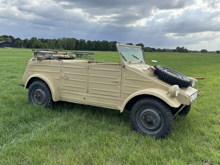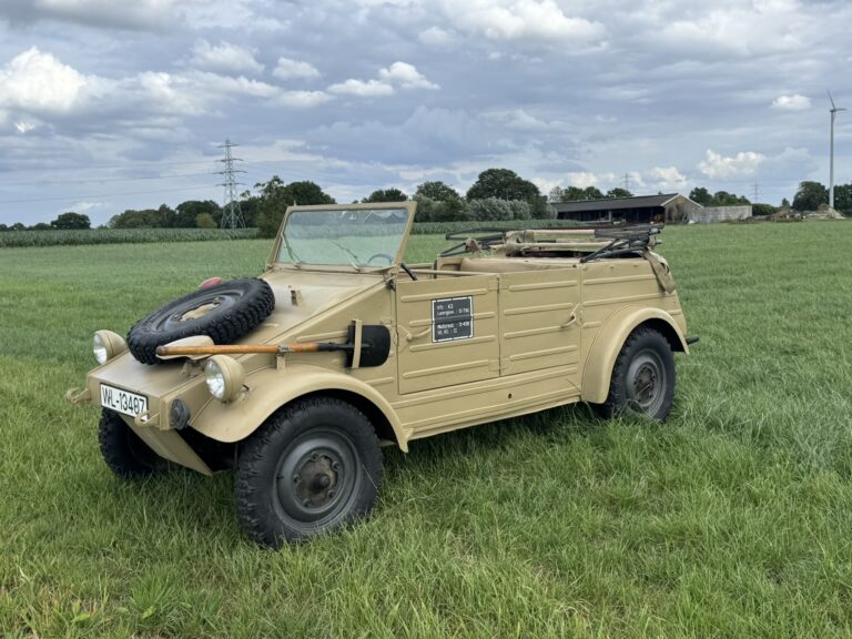 The Kübelwagen (Type 82), designed by Ferdinand Porsche and Volkswagen for the Wehrmacht, was Germany’s answer to the Jeep — lightweight, air-cooled, easy to service, and surprisingly capable off-road thanks to its clever suspension and low weight.